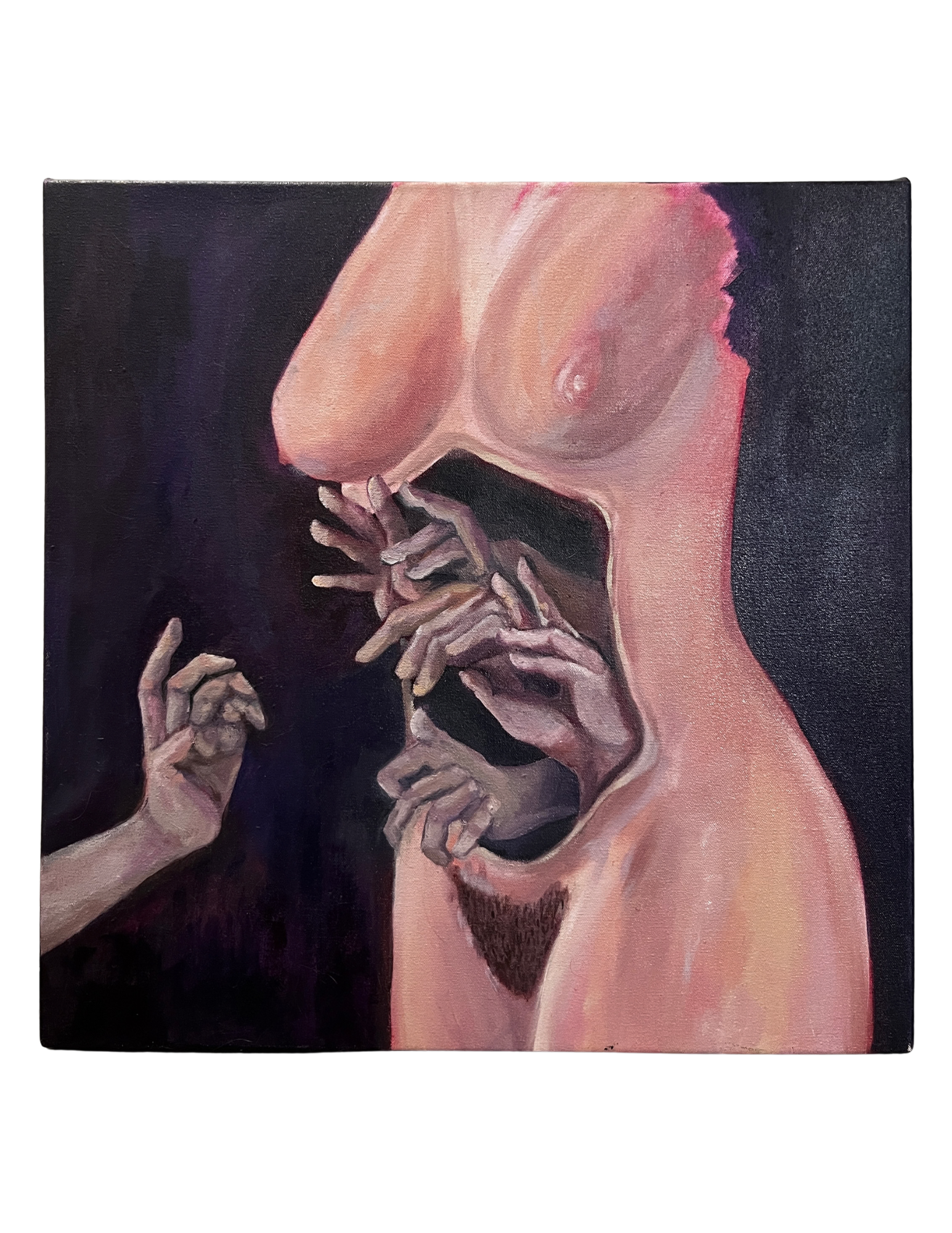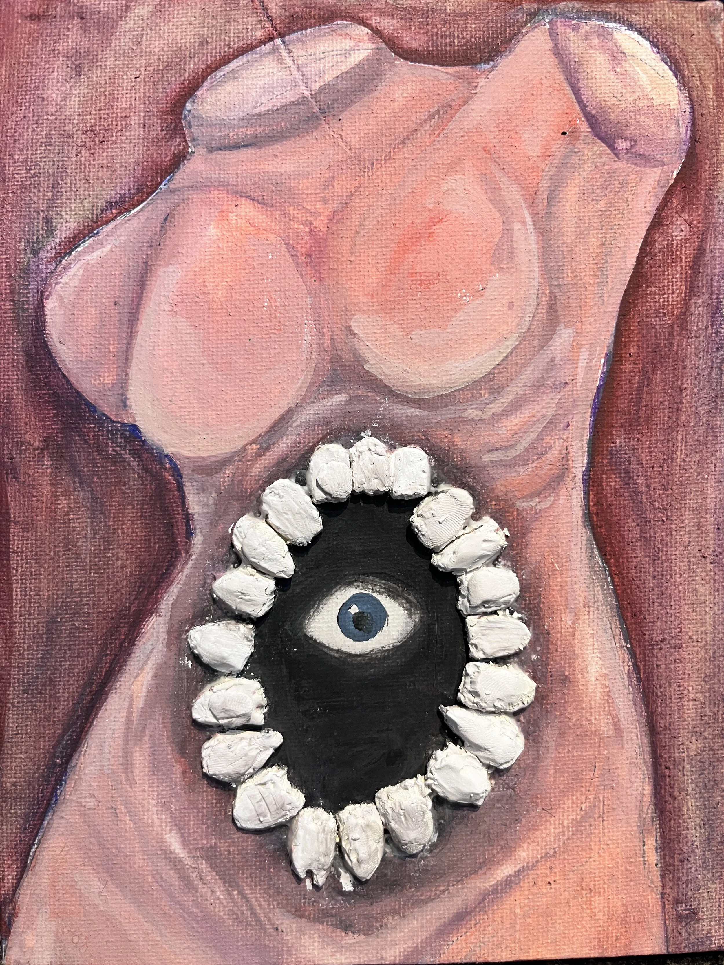 my skin, my bones, muscle, and gut. Body image has always been something I’ve struggled harshly with- seeking to regain my autonomy. Through body modifications such as piercings and tattoos, I can reclaim a sense of ownership, through abstraction and horror, I can lend the viewer a glimpse at my own understanding of myself.