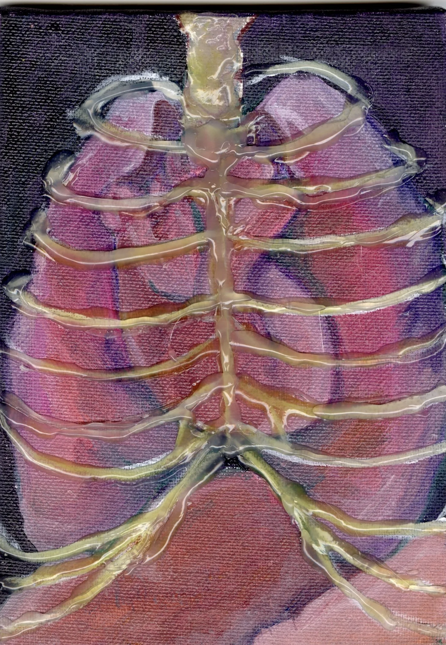 “glue lung”- oil on canvas, hot glue, 2024, 5in x 8in