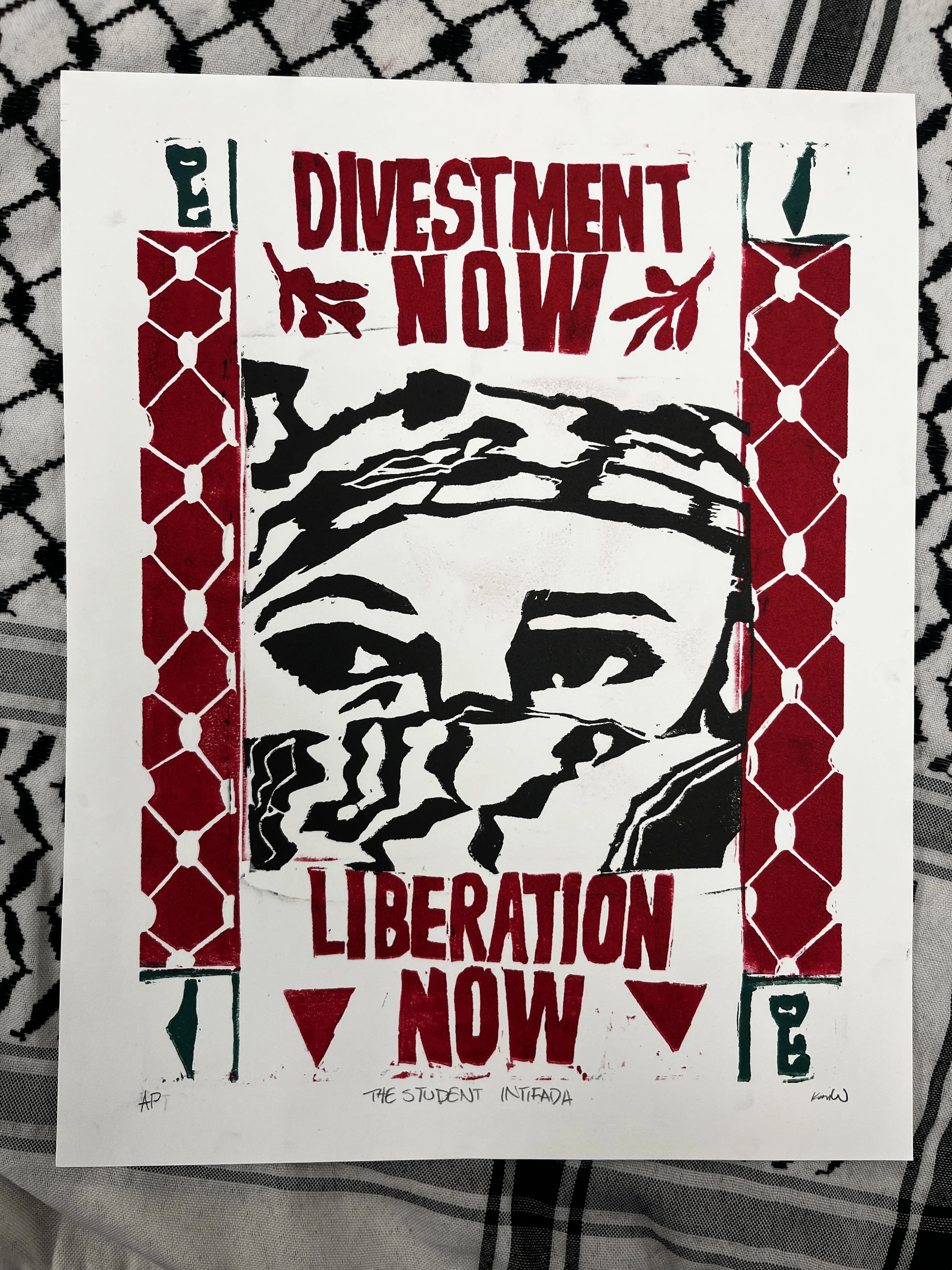 “The Student Intifada”, 2025, artist proof, linoleum print, 11in x 14in