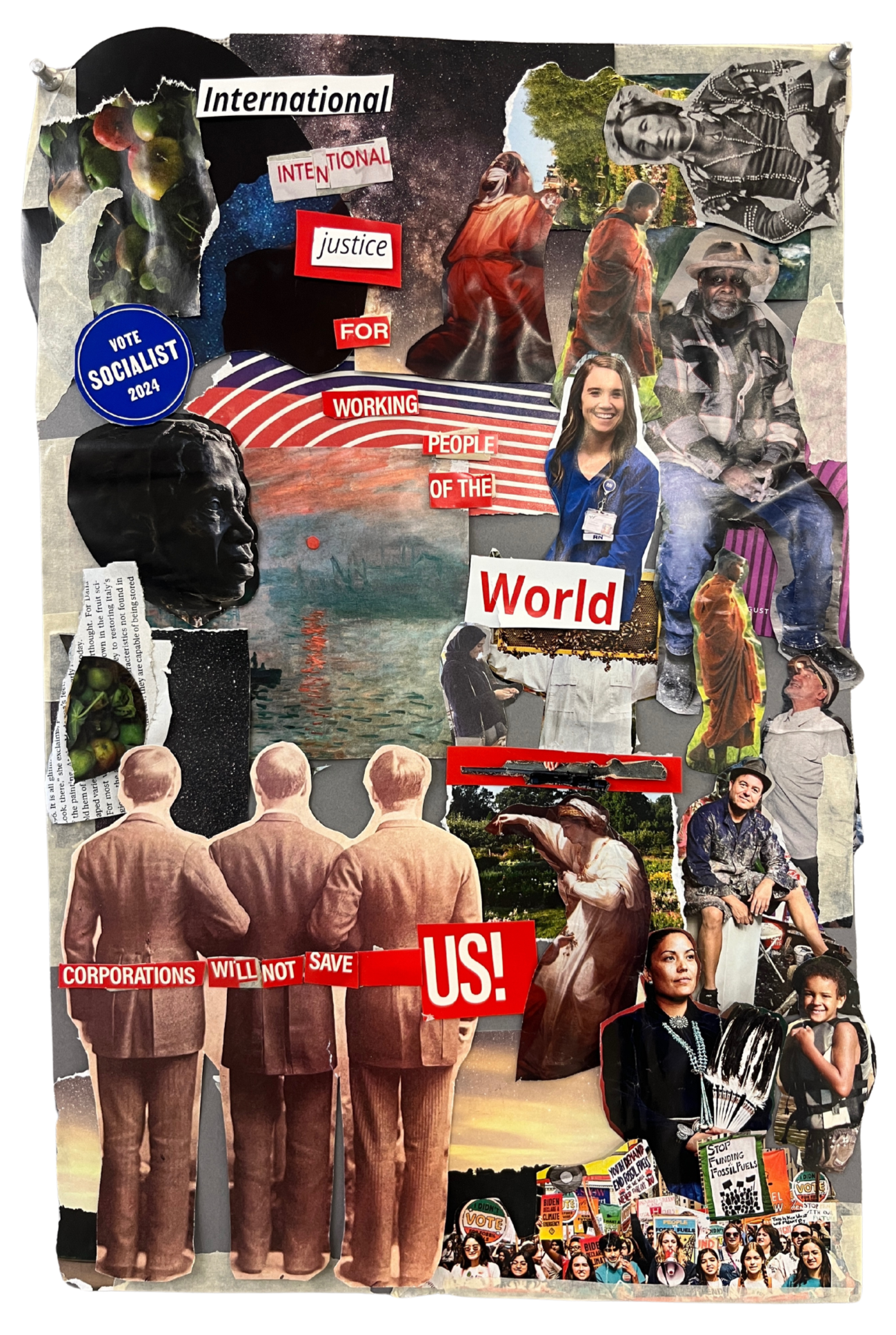 “to the people of the world,” 2025, magazine collage, 11in x 17.5in